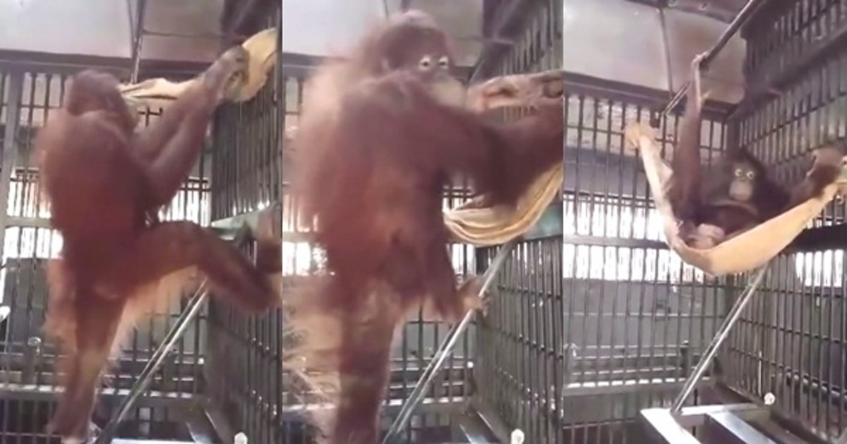 สื่ออังกฤษตีข่าวชื่นชมความฉลาดของ เจ้านีโม่ ลิงอุรังอุตังแสนรู้แห่งสวนสัตว์โคราช คว้าผ้ากระสอบไปผูกกับซี่กรงเหล็กเป็นเปลญวนแล้วนอนเล่นสบายใจเฉิบ