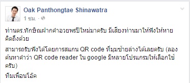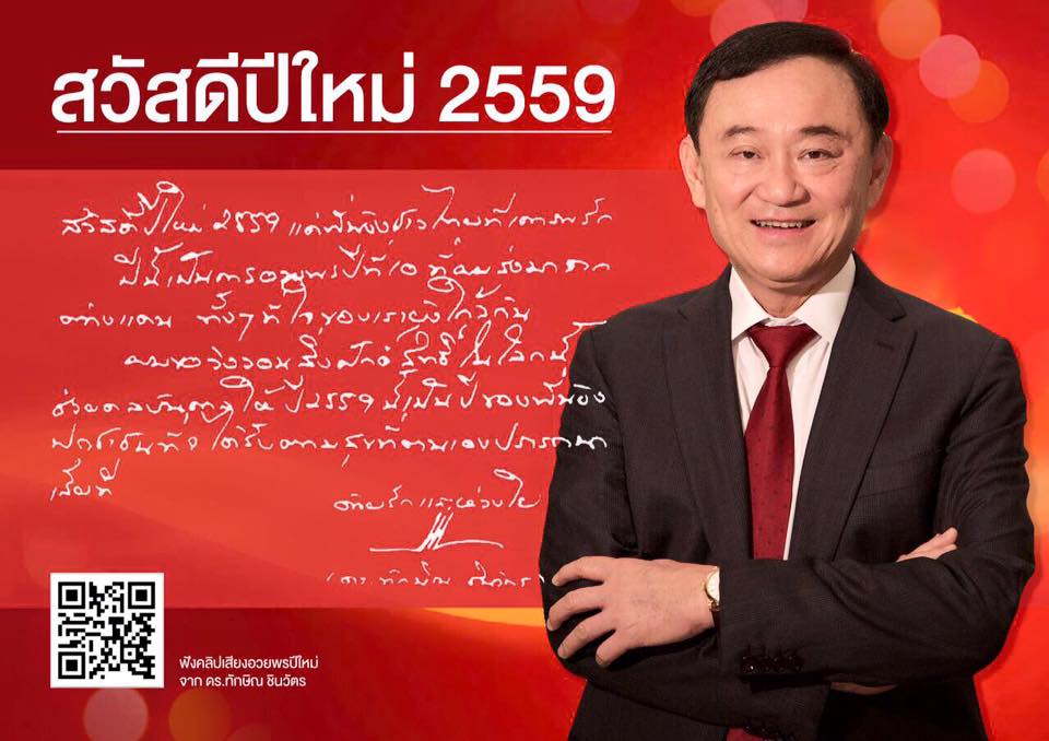 ทักษิณ ชินวัตร ร่อนการ์ดอวยพรปีใหม่ หวังปี 2559 เป็นปีของพี่น้องประชาชน ด้าน โอ๊ค พานทองแท้ แนะสาวกแม้ว เปิดเสียงอวยพร ผ่านระบบ QR Code