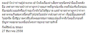 วันที่ 27 ธันวาคม 2558 ผู้สื่อข่าวรายงานว่า นายกิตติรัตน์ ณ ระนอง อดีตรัฐมนตรีว่าการกระทรวงพาณิชย์ ได้โพสต์ข้อความลงบนเฟซบุ๊กส่วนตัว "Kittiratt Na-Ranong (กิตติรัตน์ ณ ระนอง)" ระบุถึงการแถลงผลงานของรัฐบาลครบรอบ 1 ปีว่า การแถลงผลงานรัฐบาลได้มีการพาดพิงถึงรัฐบาลยิ่งลักษณ์ ชินวัตร ในเรื่องโครงการรับจำนำข้าว ซึ่งตนเห็นว่า ลุแก่อำนาจ และไร้ยางอาย เพราะการให้โอกาสแก่ผู้เกี่ยวข้องได้ชี้แจง และให้ข้อมูลเพียงพอเป็นสาระสำคัญของ พ.ร.บ.ความรับผิดทางละเมิด 2539 และระเบียบสำนักนายกรัฐมนตรีฯ ที่ใช้ประกอบ พ.ร.บ. ดังกล่าว ดังนั้นการกล่าวว่า จะไม่ขยายเวลาสอบข้อเท็จจริงจนครบถ้วนกระบวนความทั้ง ๆ ที่ผู้เกี่ยวข้องยังมีคำชี้แจง และข้อมูลที่จะแสดงต่อคณะกรรมการสอบข้อเท็จจริงอยู่อีกมาก ย่อมตีความเป็นอย่างอื่นไปไม่ได้ นอกจากจะสรุปได้ว่า ผู้มีอำนาจช่างใหญ่โตเสียจนอยู่ในภาวะ "ลุแก่อำนาจ" อย่างไม่คำนึงถึงกฎหมายของบ้านเมือง
