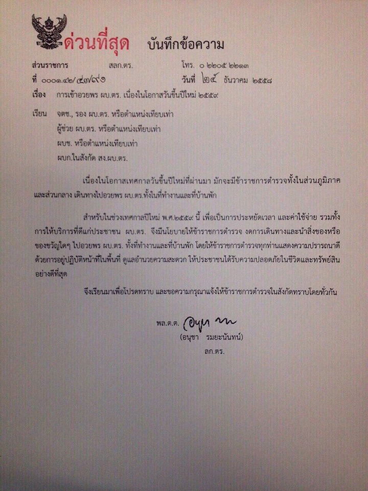 "เนื่องในโอกาสเทศกาลวันขึ้นปีใหม่ที่ผ่านมา มักจะมีข้าราชการตำรวจทั้งในส่วนภูมิภาคและส่วนกลาง เดินทางไปอวยพร ผู้บัญชาการตำรวจแห่งชาติ (ผบ.ตร.) ทั้งในที่ทำงานและที่บ้านพัก สำหรับในช่วงเทศกาลปีใหม่พ.ศ. 2559 นี้ เพื่อเป็นการประหยัดเวลา และค่าใช้จ่าย รวมทั้งการให้บริการที่ดีแก่ประชาชน ผบ.ตร. จึงมีนโยบายให้ข้าราชการตำรวจ งดการเดินทางและนำสิ่งของหรือของขวัญใด ๆ ไปอวยพร ผบ.ตร. ทั้งที่ทำงานและที่บ้านพัก โดยให้ข้าราชการตำรวจทุกนายแสดงความปราถนาดีด้วยการอยู่ปฏิบัติหน้าที่ในพื้นที่ ดูแลอำนวยความสะดวกให้ประชาชนได้รับความปลอดภัยในชีวิตและทรัพย์สินอย่างดีที่สุด"