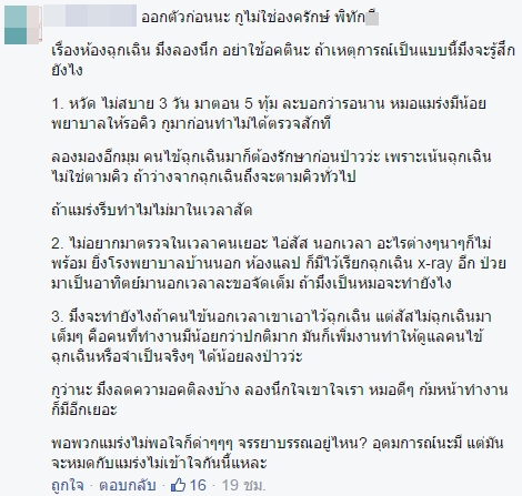 และอีกโพสต์หนึ่งที่คุณหมอรายดังกล่าวโพสต์ ก็ระบุอีกว่า เมื่อไรหมอจึงจะมีสิทธิ์ไล่คนไข้ที่ไม่ฉุกเฉินให้กลับบ้าน ซึ่งห้องฉุกเฉินมีไว้สำหรับเหตุฉุกเฉิน ไม่ใช่คลินิกที่เปิดตลอด 24 ชั่วโมง