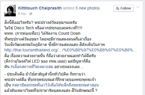 วันที่ 30 ธันวาคม 2558 เฟซบุ๊ก Kittitouch Chaiprasith ของนายกิตติธัช ชัยประสิทธิ์ อาจารย์จากจุฬาลงกรณ์มหาวิทยาลัย ได้ออกมาตำหนิการฉายแสงใส่พระปรางค์วัดอรุณ ของผู้จัดแห่งหนึ่ง เพื่อที่จะนำภาพนั้นไปเผยแพร่ให้กับสื่อต่างประเทศ เพื่อประชาสัมพันธ์ประเทศไทย และโปรโมทงานเคาท์ดาวน์ในกรุงเทพมหานคร โดยนายกิตติธัช ชัยประสิทธิ์ ได้ออกมามาวิจารณ์ว่า การกระทำแบบนี้ ถือว่าเลือกสถานที่ไม่เหมาะอย่างรุนแรง