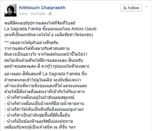 ต่อมา นายกิตติธัช ก็ได้ออกมาเผยว่า การที่มีคนนำรูปการฉายแสงไฟในโบสถ์ La Sagrada Famila ที่เมืองบาร์เซโลน่า ประเทศสเปน มาเปรียบเทียบกับการฉายแสงที่พระปรางค์วัดอรุณนั้น นายกิตติธัช ชี้ว่า ตนไม่ใช่ว่าไม่เห็นด้วยกับการฉายแสงสี แต่ถ้าจะแสดงนั้น ต้องดูว่าเป็นแบบใด อย่างแสงสีที่ La Sagrada Famila จะเน้นการจัดแสงแบบธรรมชาติ สื่อถึงป่า น้ำตก ท้องฟ้า หินผา อันเป็นการแสดงถึงความเคารพต่อพระผู้เป็นเจ้า ต่างกับบ้านเราที่ฉายไฟแบบดิสโก้ ไม่เหมาะสำหรับพระปรางค์วัดอรุณฯ