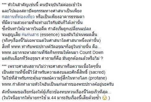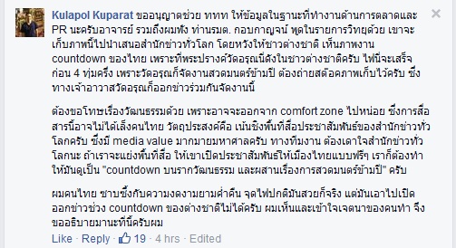 อย่างไรก็ตาม ได้มีคอมเม้นท์หนึ่ง ที่มาบอกว่า การฉายแสงแบบนี้ ก็เพราะทาง ททท. ต้องการเก็บภาพไปใช้ในการโปรโมทการท่องเที่ยว เพื่อให้เห็นภาพการเคาท์ดาวน์ของไทย ด้านเจ้าอาวาสวัดก็ให้การสนับสนุนอย่างดี พร้อมออกมาขอโทษเรื่องวัฒนธรรม แต่สิ่งที่ทำ เพราะกลุ่มเป้าหมายคือต่างชาติ เน้นการชิงพื้นที่ประชาสัมพันธ์ ซึ่งมี media value มหาศาล ซึ่งหากต้องการได้พื้นที่สื่อแบบฟรี ๆ ก็ต้องเปิดการประชาสัมพันธ์ให้ดูเหมือนการเคาท์ดาวน์บนรากฐานวัฒนธรรม