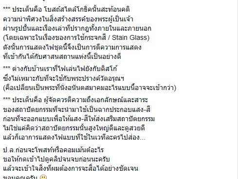 ทั้งนี้ นายกิตติธัช ชัยประสิทธิ์ ได้ออกมาติงว่า การฉายแสงที่พระปรางค์วัดอรุณ เพื่อโปรโมทการท่องเที่ยวนั้น หากจะทำก็ถือว่าฉายแสงได้สวยงาม แต่เลือกสถานที่ไม่เหมาะสมอย่างรุนแรง เพราะพระปรางค์นั้น เป็นสถานที่บรรจุพระบรมสารีริกธาตุของพระพุทธเจ้า เป็นสถาปัตยกรรมที่เอาไว้เพื่อให้ระลึกถึงพุทธธรรมคำสอน สิ่งสำคัญของสถาปัตยกรรมทางศาสนา คือการที่ผู้คนได้เสพจนเกิดความน่าพิศวง จนเกิดแรงดึงดูดและมีสมาธิกับสิ่งที่อยู่ตรงหน้า อีกทั้งที่แห่งนี้ ยังมีลักษณะเป็นอนุสาวรีย์ เปรียบเสมือนดวงตาแห่งธรรมะ ที่เฝ้ามองผู้คนในปริมณฑลโดยรอบ ทำให้คนตระหนักว่าตนอยู่ภายใต้สายตาสิ่งศักดิ์สิทธิ์ สถาปัตยกรรมแห่งนี้จึงเปรียบเสมือนเครื่องมือในการควบคุมด้านศีลธรรม