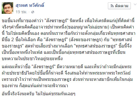 ต่อมา เฟซบุ๊ก สุรพศ ทวีศักดิ์ ได้มีการโพสต์อธิบายเกี่ยวกับที่มาของคำว่า พระสังฆราษฎร์ ดังนี้