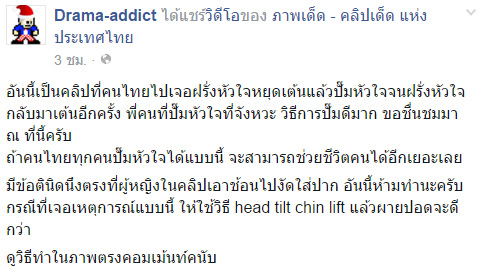 ด้านเฟซบุ๊ก Drama-addict ซึ่งเจ้าของเพจนั้นเป็นหมอ ระบุว่า คนที่ปั๊มหัวใจในคลิปนี้ วิธีการปั๊มดีมาก แต่มีข้อติติงเล็กน้อยคือ การที่ผู้หญิงในคลิปได้ให้เอาช้อนงัดปาก อันนี้เป็นสิ่งที่ไม่ควรทำ