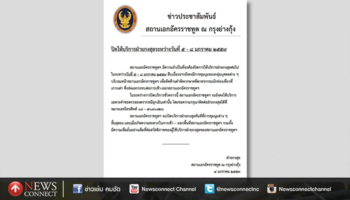 อย่างไรก็ตาม จะเปิดบริการฝ่ายกงสุลทันทีหลังการชุมนุมดังกล่าวสิ้นสุดลง หรือเมื่อเกิดความสะดวกในการเข้า-ออกพื้นที่ หรือเห็นแล้วว่ามีความสะดวกและปลอดภัยต่อสวัสดิภาพของผู้ใช้บริการ