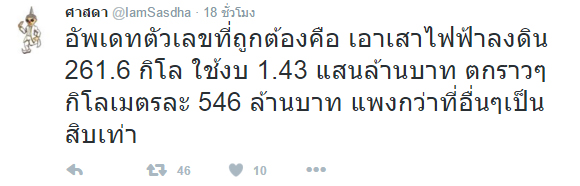อย่างไรก็ดี ล่าสุดวันที่ 13 มกราคม 2559 เพจดัง ศาสดา ได้โพสต์ข้อความผ่าน ทวิตเตอร์ @IamSasdha โดยตั้งข้อสังเกตว่า งบประมาณในการนำสายไฟฟ้าลงดิน เฉลี่ยแล้วตกกิโลเมตรละประมาณ 1,000 ล้านบาท ซึ่งงบประมาณดังกล่าวเทียบเท่ากับการสร้างรถไฟฟ้า BTS เลยทีเดียว ในขณะที่เทศบาลนครหาดใหญ่ใช้งบประมาณในการนำสายไฟฟ้าลงดินเพียงแค่ 20-30 ล้านต่อกิโลเมตรเท่านั้น
