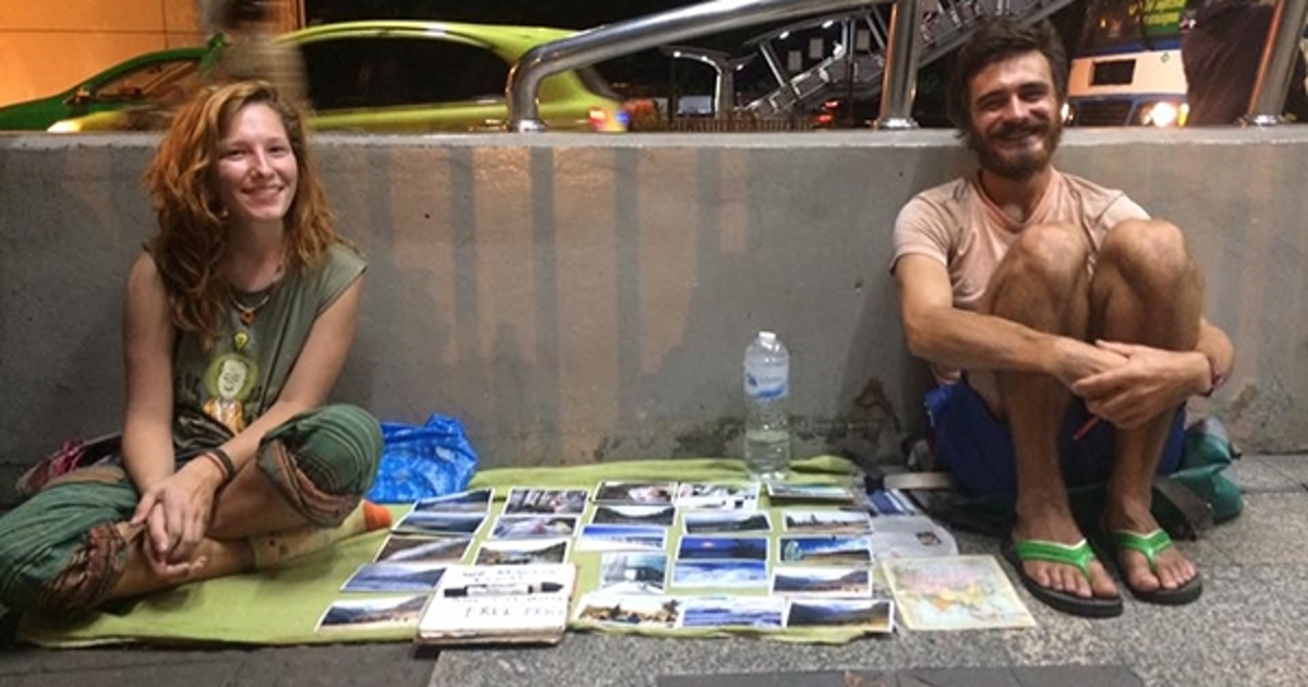 เมื่อเข้าไปพูดคุย ก็ได้คำตอบว่า ชาวต่างชาติชายหญิงคู่นี้เป็นชาวรัสเซีย ตั้งใจจะออกเดินทางรอบโลกเป็นเวลา 1 ปีหลังเรียนจบ แต่เป็นการท่องเที่ยวที่แทบไม่ใช้เงิน อาศัยโบกรถและนอนกางเต็นท์ ที่น่าทึ่งคือ เขาบอกว่ามาเมืองไทยได้ 4-5 วันแล้ว แต่เพิ่งใช้เงินไปแค่ 300 บาทเท่านั้นเอง