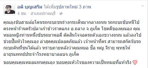 โดยผู้โพสต์เล่าว่า มีลุงขับสามล้อคนหนึ่งถูกรถกระบะชนร่างกระเด็นกลางถนน ก่อนที่รถกระบะจะขับหนีไป บริเวณตรงหน้าร้านครัวปลาเก๋าข้าวราดแกง อ.ถลาง จ.ภูเก็ต แต่โชคดีที่มีแพทย์หญิงรายหนึ่ง ทราบชื่อคือ พญ.จิรายุ พุทธให้ อายุรแพทย์ประจำโรงพยาบาล อบจ.ภูเก็ต ขับรถมาเจอพอดีและได้ลงจากรถมาช่วยเหลือผู้ได้รับบาดเจ็บจนปลอดภัย ซึ่งภายหลังมีรายงานเพิ่มเติมว่า เจ้าหน้าที่ตำรวจได้สกัดจับรถกระบะคันดังกล่าวได้แล้ว