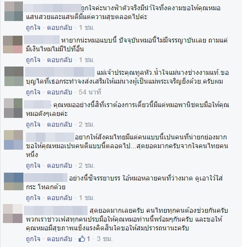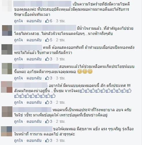 ทั้งนี้ด้านชาวเน็ตที่เห็นเรื่องราวดังกล่าวก็ได้เข้ามาแสดงความคิดเห็นชื่นชมแพทย์หญิงน้ำใจงามคนดังกล่าวมากมาย โดยบอกว่า นี่แหละคือจรรยาบรรณของคนเป็นหมอที่แท้จริง เมื่อเห็นคนเจ็บอยู่ตรงหน้าก็ลงมาช่วยเหลือพร้อมกับยกให้เป็นนางฟ้าตัวจริง