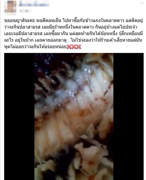 นอกจากนี้ เจ้าของเรื่องยังระบุว่า ขออนุญาตนะคะ พอดีตอนเย็น ไปหาซื้อกับข้าวแกงในตลาด..... แต่คิดอยู่ว่าจะกินปลาสามรส มีอยู่ร้านหนึ่งในตลาดดาว กินอยู่บ้างแต่ไม่ประจำ เลยซื้อมากิน แต่สุดท้ายกินได้ช้อนหนึ่ง รู้สึกเหมือนมีอะไรอยู่ในปาก เลยคายออกมาดู...ไม่ใช่จะลงว่าให้ร้านเค้าเสียหาย แต่มันพูดไม่ออก