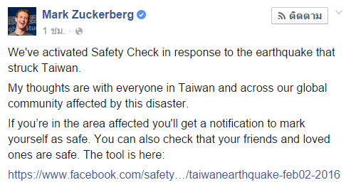 ขณะที่ต่อมา เฟซบุ๊ก Mark Zuckerberg ของ มาร์ค ซัคเคอร์เบิร์ก ผู้บริหารเฟซบุ๊ก ก็ได้ออกมาประกาศให้บริการตรวจสอบความปลอดภัยของเพื่อน จากเหตุแผ่นดินไหวไต้หวัน โดยสามารถเข้าถึงบริการดังกล่าวได้ ที่นี่ คลิก