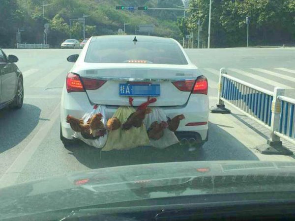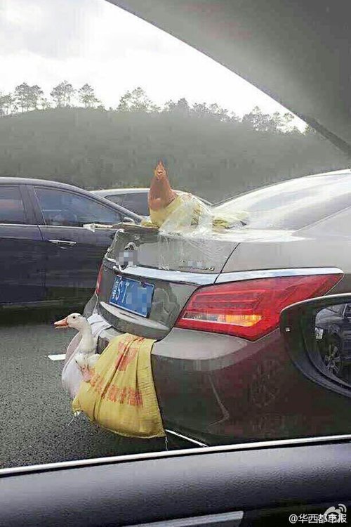 เฟซบุ๊ก People's Daily, China เผยภาพชวนตะลึง หลังมีผู้ใช้รถยนต์รายหนึ่งบันทึกไว้ได้ เป็นภาพเก๋งหรูที่เอาสกอตเทปแปะไก่ไว้ที่ท้ายรถ ส่วนเป็ดก็จับใส่ถุงห้อยออกมาจากกระโปรงหลังอีกที ท่าทางคงจะขนกลับไปที่บ้าน แต่ไม่อยากให้ในรถต้องสกปรก เลยหอบหิ้วกันมาแบบนี้แหละ