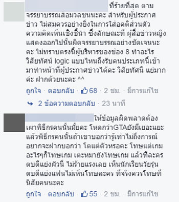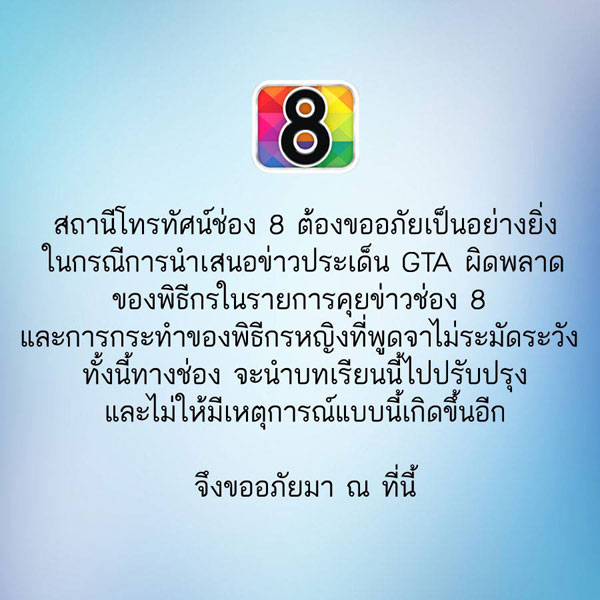 ช่อง 8 โร่ขอโทษ ปมเสนอข่าวเกม GTA ผิดพลาด-ผู้ประกาศข่าวสาว ประจำรายการคุยข่าว แนะให้เผาแผ่นทิ้ง ด้านเกมเมอร์ยังไม่พอใจ ร้องออกมาชี้แจงความจริงเกี่ยวกับเกมเพิ่มเติม
