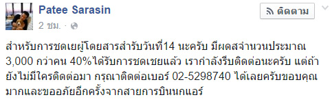 เมื่อวันที่ 17 กุมภาพันธ์ 2559 เฟซบุ๊ก Patee Sarasin ของนายพาที สารสิน เจ้าของสายการบินนกแอร์ มีการโพสต์ข้อความชดเชยค่าโดยสารในเที่ยวบินที่มีปัญหาของวันที่ 14 กุมภาพันธ์ที่ผ่านมาว่า ผู้โดยสารประมาณร้อยละ 40 ได้รับการชดเชยแล้ว