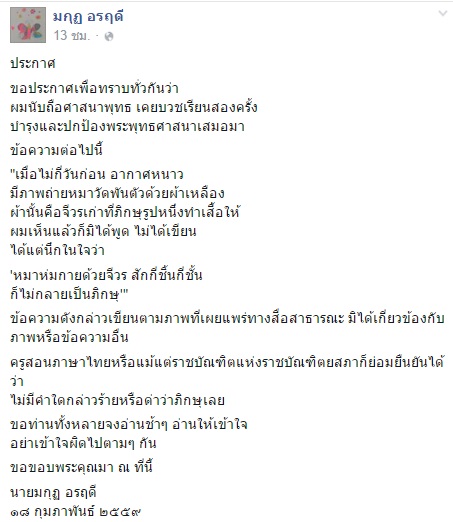 ล่าสุดวันนี้ (18 กุมภาพันธ์ 2559) นายมกุฏ ได้โพสต์เฟซบุ๊กชี้แจงถึงกรณีดังกล่าวว่า ข้อความดังกล่าวเขียนตามภาพที่เผยแพร่ทางสื่อสาธารณะ มิได้เกี่ยวข้องกับภาพหรือข้อความอื่น ครูสอนภาษาไทยหรือแม้แต่ราชบัณฑิตแห่งราชบัณฑิตยสภาก็ย่อมยืนยันได้ว่าไม่มีคำใดกล่าวร้ายหรือด่าว่าภิกษุเลย