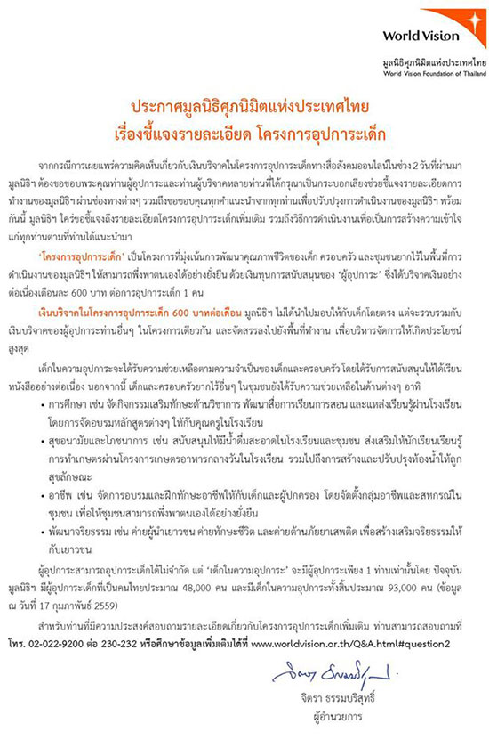 เพจเฟซบุ๊ก มูลนิธิศุภนิมิตแห่งประเทศไทย World Vision Foundation of Thailand ได้ออกมาชี้แจงเรื่องดังกล่าวแล้วว่า โครงการดังกล่าวมีการรับเงินบริจาคจากผู้อุปการะต่อเนื่องเดือนละ 600 บาท ซึ่งเด็ก 1 คนจะมีผู้อุปการะ 1 คน โดยเงินบริจาคเดือนละ 600 บาท ทางมูลนิธิฯ ไม่ได้นำไปมอบให้กับเด็กโดยตรงแต่จะรวบรวมกับเงินบริจาคของผู้อุปการะท่านอื่น ๆ ในโครงการเดียวกัน และจัดสรรลงไปยังพื้นที่ทำงานให้เกิดประโยชน์สูงสุด