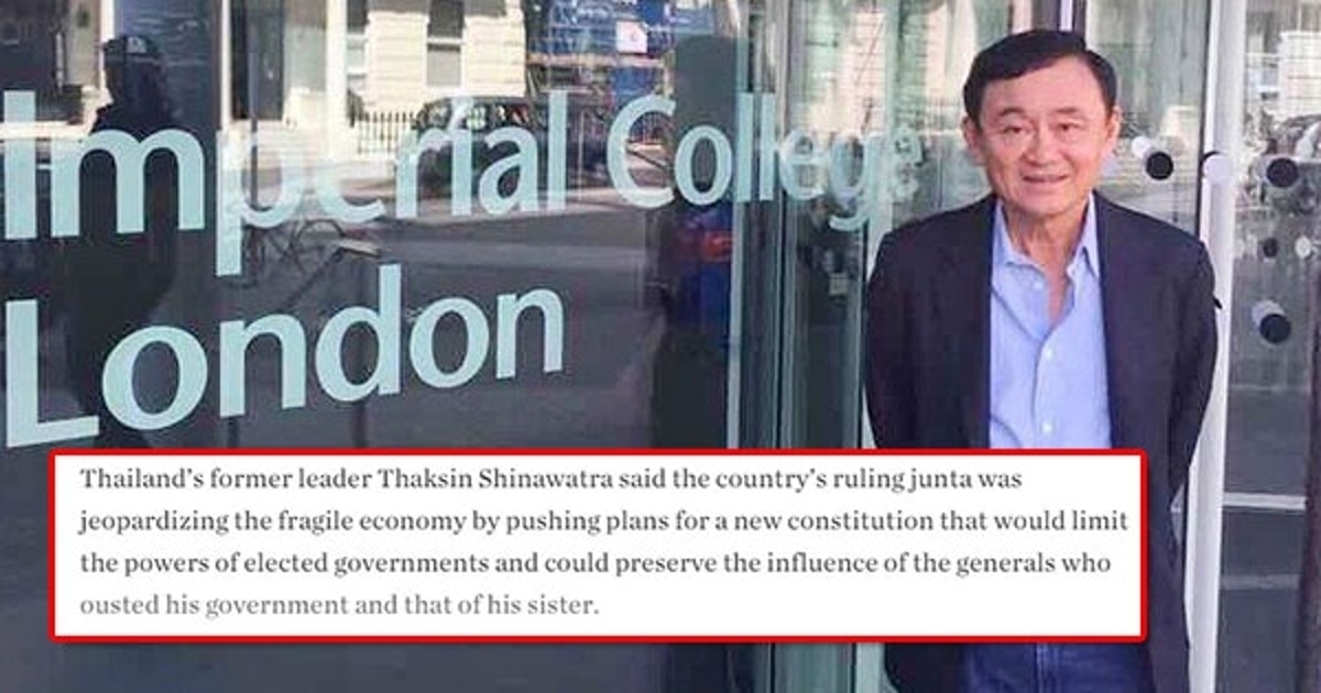 ทักษิณ ชินวัตร ให้สัมภาษณ์ วอลล์สตรีทเจอร์นัล ชี้รัฐบาล คสช. กำลังทำให้เศรษฐกิจย่ำแย่ จากการพยายามออกร่างรัฐธรรมนูญที่จำกัดอำนาจของรัฐบาลที่มาจากการเลือกตั้ง หากต้องการให้เทศไทยเดินหน้า ควรเจรจากับทุกกลุ่มการเมือง