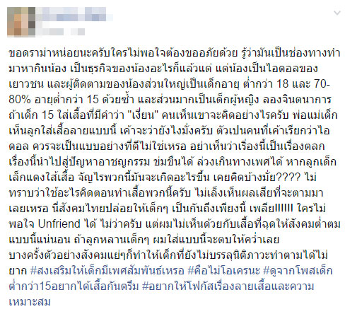 สวดยับ เน็ตไอดอลขายเสื้อยืดส่อข้อความเรื่องเพศ "เงี่ยน-9 นิ้ว" ชี้ ส่งเสริมอาชญากรรมทางเพศ และพ่อแม่คงไม่ชอบใจแน่ ๆ