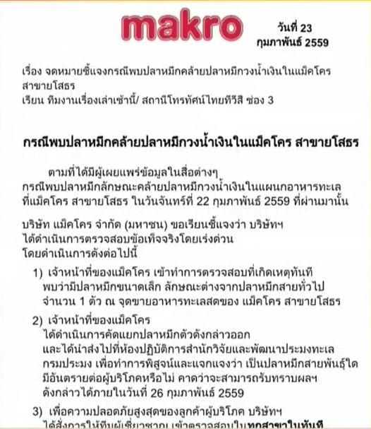 แม็คโคร ส่งจดหมายชี้แจง กรณีพบปลาหมึกคล้ายปลาหมึกวงน้ำเงิน มีพิษร้ายแรงวางขายปะปน เผยส่งปลาหมึกตรวจสอบแล้ว คาดรู้ผลใน 2 วัน พร้อมสั่งเก็บกุ้งแม่น้ำทั้งหมด ตรวจสอบมีตะกั่วจริงหรือไม่