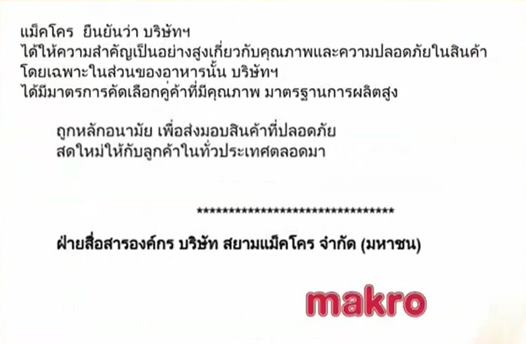 พร้อมกันนี้เพื่อความปลอดภัยของผู้บริโภค ทางแม็คโครยังได้ส่งทีมผู้เชี่ยวชาญตรวจสอบแม็คโครทุกสาขาทันที และจนขณะนี้ยังไม่พบว่ามีความผิดปกติใด ๆ