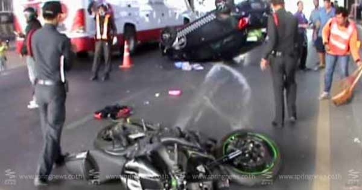 นักเรียน ม.5 จ.นครราชสีมา ซิ่งบิ๊กไบค์ขี่ 100 กิโลเมตรต่อชั่วโมง รีบไปสอบ เข้าโค้งไม่เห็นคนข้าม พุ่งชนลุงขณะเดินข้ามถนนขาขาด ไถลชนเก๋งซ้ำ ทำรถหมุน เจ็บ 3 ราย