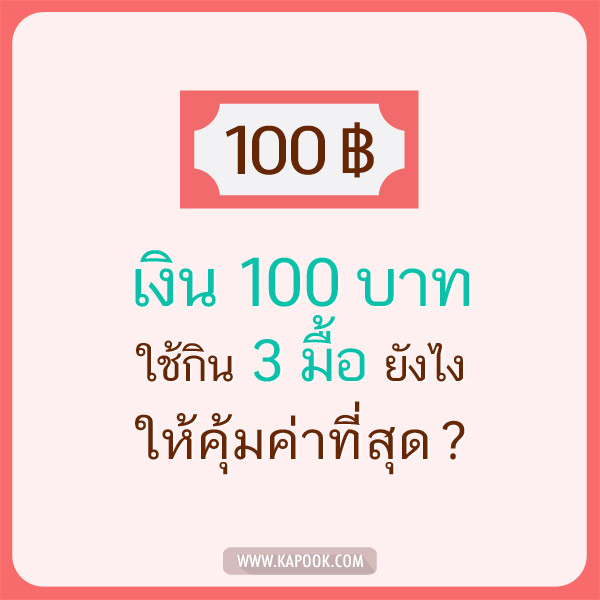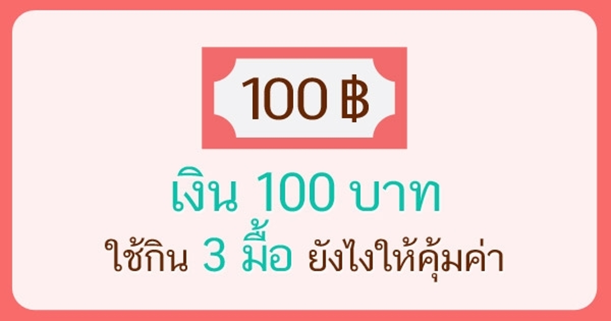 ลองมาวางแผนกันดูเล่น ๆ นะคะ ว่าเราจะบริหารเงิน 100 บาทอย่างไร ? ให้คุ้มกับค่าอาหาร 3 มื้อ (แค่ค่าอาหารอย่างเดียวนะคะ) จะซัดบะหมี่กึ่งสำเร็จรูปไปเลย 3 มื้อ อาจจะคุ้มในด้านปริมาณ หรือ ซื้อผักสด-เนื้อสัตว์มาทำอาหารเอง ได้ด้านโภชนาการ แต่ไม่ถูกราคาเท่าไร หรือจะออกไปทานร้านข้าวแกงริมทางราคาประหยัด ลองมาคิดและแลกเปลี่ยนกันดูนะคะ ว่าแบบไหนจะอิ่มคุ้มค่าราคา 100 บาทที่สุด