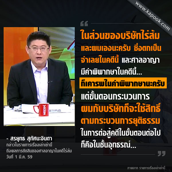 สรยุทธ สุทัศนะจินดา จัดรายการเรื่องเล่าเช้านี้ ทางช่อง 3 ตามปกติ และอ่านคดีบริษัทไร่ส้มด้วยตัวเอง พร้อมยืนยันขอต่อสู้คดีตามกระบวนการยุติธรรม