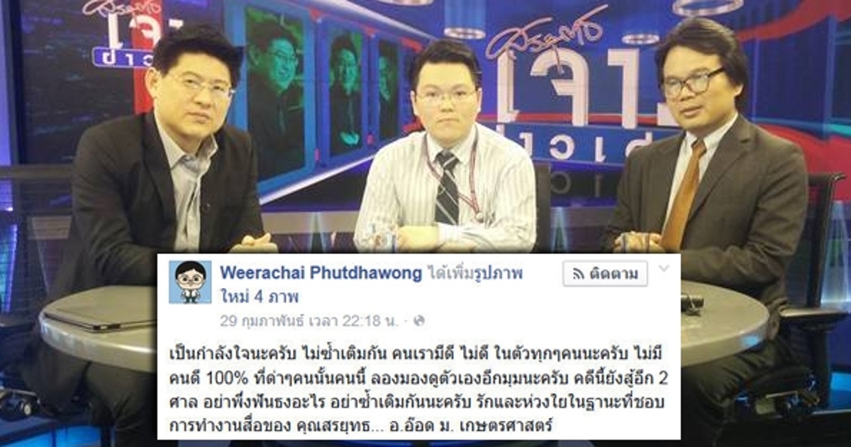 รศ. ดร.วีรชัย พุทธวงศ์ อาจารย์ ม.เกษตร ไม่ขออิงกระแส โพสต์ให้กำลังใจ สรยุทธ สุทัศนะจินดา บอกคนเรามีดี ไม่ดี ในตัวทุกคน ย้ำคดียังไม่สิ้นสุด อย่าพึ่งฟันธงอะไร