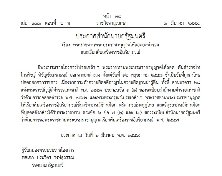 วันที่ 3 มีนาคม 2559 ผู้สื่อข่าวรายงานว่า เว็บไซต์ราชกิจจานุเบกษาได้เผยแพร่ประกาศสำนักนายกรัฐมนตรี เรื่อง พระราชทานพระบรมราชานุญาตให้ถอดยศตำรวจและเรียกคืนเครื่องราชอิสริยาภรณ์ โดยมีรายละเอียดดังนี้