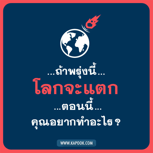 ลองคิดดูว่าหากเรื่องวันสิ้นโลกเป็นเรื่องจริง และมันจะเกิดขึ้นในวันพรุ่งนี้ คุณอยากจะทำอะไรในตอนนี้ ก่อนที่จะไม่ได้ทำมันอีก อาจจะเป็นคำตอบง่าย ๆ แบบ ไม่ทำอะไรเลย อะไรจะเกิดก็ต้องเกิด หรืออยากจะใช้เวลาที่เหลือกับคนที่รัก (โรแมนติกได้อีก) หรือว่าจะหาวิธีเอาตัวรอดเมื่อภัยจะมา มาแลกเปลี่ยนความคิดเห็นกันดูนะคะ