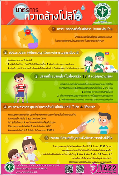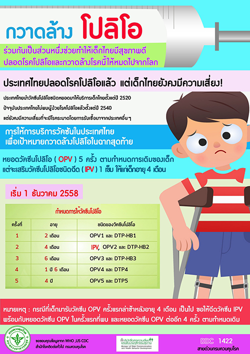 นายแพทย์อำนวย กาจีนะ อธิบดีกรมควบคุมโรค กล่าวว่า แม้ว่าประเทศไทยไม่มีผู้ป่วยโปลิโอ ตั้งแต่ปี 2540 แต่ในปัจจุบันทั่วโลก ยังมีผู้ป่วยโปลิโอในบางประเทศ ประเทศไทยจึงยังมีความเสี่ยงที่จะพบผู้ป่วยรายใหม่ โดยเฉพาะการแพร่ระบาดจากประเทศที่พบผู้ป่วย องค์การอนามัยโลก จึงกำหนดเป้าหมายการกวาดล้างโปลิโอทั่วโลก ซึ่งทุกประเทศจะร่วมดำเนินงานด้วย โดยแนะนำให้นำวัคซีนโปลิโอชนิดฉีดมาใช้ 1 เข็ม ร่วมกับหยอดวัคซีนโปลิโอชนิดใหม่ ซึ่งวัคซีนชนิดใหม่จะมีประโยชน์ เพื่อป้องกันควบคุมโรคโปลิโอให้ดียิ่งขึ้น และเด็กไทยจะปลอดภัยจากเชื้อโปลิโอที่อาจนำเข้ามาจากประเทศอื่นได้