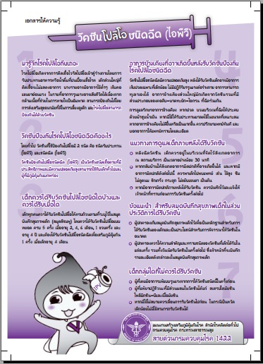 ทั้งนี้ ปกติวัคซีนที่ใช้ป้องกันโปลิโอมี 2 ชนิด คือ ชนิดรับประทาน(โอพีวี) และ ชนิดฉีด(ไอพีวี) ซึ่งเด็กทุกคน ควรได้รับวัคซีนโปลิโอให้ครบถ้วนตามที่ระบุไว้ในสมุดบันทึกสุขภาพแม่และเด็ก หรือสมุดสีชมพู โดยควรได้รับวัคซีนโปลิโอแบบหยอดครบ 5 ครั้ง เมื่ออายุ 2 เดือน 4 เดือน 6 เดือน อายุ 1 ปีครึ่ง และอายุ 4 ปี และต้องได้รับวัคซีนโปลิโอชนิดฉีดเพื่อเสริมภูมิคุ้มกัน 1 ครั้ง เมื่อเด็กอายุ 4 เดือน ซึ่งวัคซีนป้องกันโปลิโอชนิดฉีด (ไอพีวี) ซึ่งผู้ปกครองควรให้ความสำคัญและทราบชนิดของวัคซีนที่เด็กได้รับในแต่ละครั้ง รวมทั้งวันนัดรับวัคซีนในครั้งต่อไป ซึ่งเจ้าหน้าที่จะบันทึกรายละเอียดดังกล่าวลงในสมุดบันทึกสุขภาพเด็ก