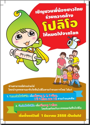 ทั้งนี้ การฉีดวัคซีนโปลิโอที่อายุ 4 เดือนจะเริ่มในวันที่ 1ธันวาคม 2558 เป็นต้นไป ซี่งจะเป็นการสร้างภูมิคุ้มกันแก่เด็กไทยให้มีภูมิต้านทานต่อเชื้อโปลิโอทั้ง 3ชนิด คือ ชนิดที่ 1, 2 และ 3 และในเดือนเมษายน 2559 จะมีการสับเปลี่ยนวัคซีนรูปแบบรับประทานที่ประกอบด้วยไวรัส3 ชนิด คือไวรัสโปลิโอชนิดที่ 1,2 และ 3เป็นวัคซีนรูปแบบรับประทานชนิดที่มีไวรัส 2 ชนิด คือ ชนิดที่ 1 และ 3 โดยนำเชื้อไวรัสชนิดที่2 ออกไป ซึ่งการสับเปลี่ยนวัคซีนจะดำเนินการโดยพร้อมเพรียงกันทั่วโลก ทำให้เชื้อโปลิโอชนิดที่2 ถูกกวาดล้างหมดไปจากโลกของเรา ซึ่งทุกประเทศมีคำมั่นสัญญาร่วมกันและคาดหวังว่าในปีพ.ศ.2563 จะกำจัดเชื้อไวรัสโปลิโอ ทุกชนิดให้หมดไปจากโลกได้