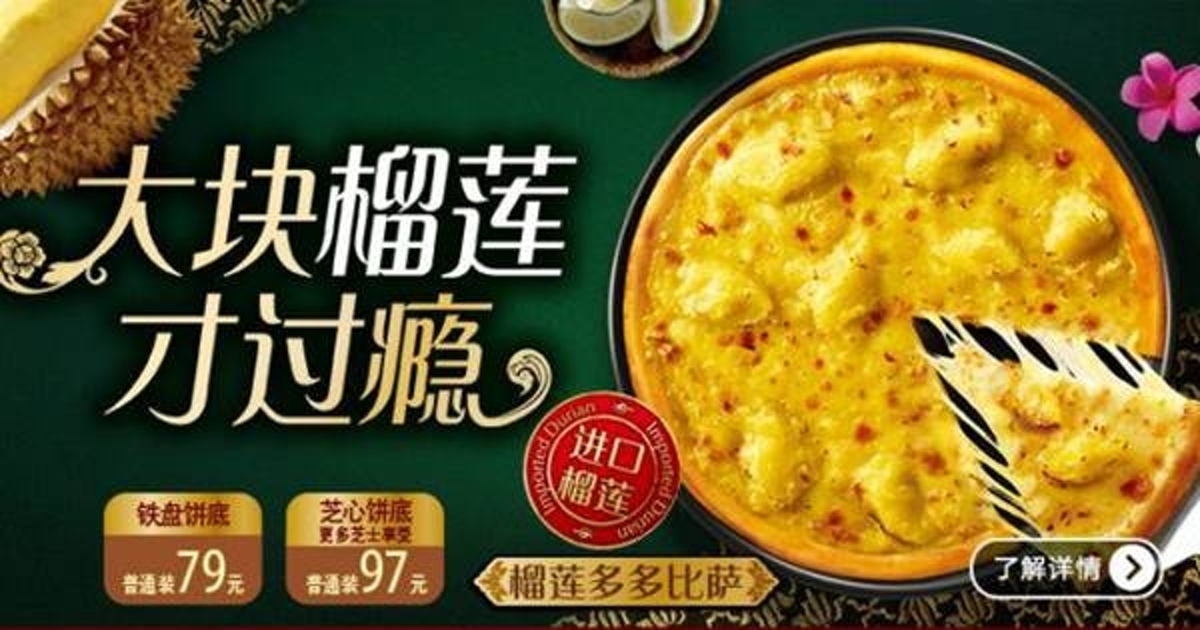 พิซซ่าฮัท เปิดตัวพิซซ่าหน้าทุเรียน ในประเทศจีน เอาใจคนรักทุเรียนด้วยส่วนผสมระหว่าง ทุเรียนและชีส เหนียวหนึบนุ่มลิ้น วางขายในเวลาจำกัด
