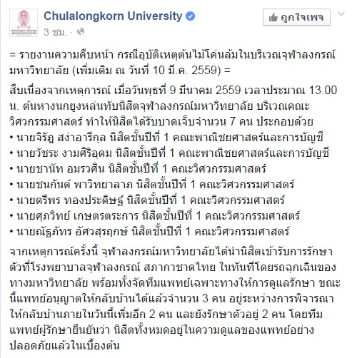 อย่างไรก็ดี เมื่อวันที่ 10 มีนาคม 2559 เฟซบุ๊ก Chulalongkorn University ได้มีการโพสต์รายละเอียดเกี่ยวกับนิสิตที่ได้รับบาดเจ็บ รวมถึงการรักษาพยาบาล และมาตรการสอนเสริม ดังต่อไปนี้