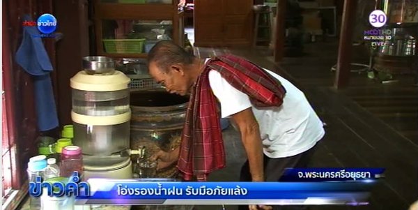 จากกรณีที่มีการนำเสนอข่าววิกฤตภัยแล้งในหลายพื้นที่ของประเทศไทยไปแล้วนั้น ล่าสุดวันที่ 10 มีนาคม 2559 ผู้สื่อข่าวรายงานว่า นายอุดม ลาภภักดี อายุ 70 ปี ชาวบ้านใน ต.บางปะแดง อ.บางปะอิน จ.พระนครศรีอยุธยา เปิดเผยถึงวิธีการกักเก็บน้ำไว้ใช้ในวิกฤตภัยแล้งว่า ตนเองได้รองน้ำฝนที่ไหลลงจากหลังคาบ้านไว้ในโอ่งขนาด 1,2000 ลิตร จำนวน 16 ใบ ที่ตั้งไว้รอบบ้านคิดเป็นปริมาณน้ำไม่น้อยกว่า 19,000 ลิตร เพื่อเก็บไว้กินในครอบครัวมานานกว่า 45 ปีแล้ว โดยไม่ต้องเสียเงินซื้อน้ำและน้ำฝนที่นำมาดื่มก็ให้ความรู้สึกชื่นใจ ปลอดภัยเพราะโอ่งทุกใบมีฝาปิดสนิท เมื่อต้องการใช้น้ำก็นำเครื่องปั๊มน้ำมาสูบจากโอ่งขึ้นไปใส่โอ่งมังกรที่อยู่บนบ้านและเชื่อว่าจะมีน้ำใช้ได้นานถึง 2 ปี