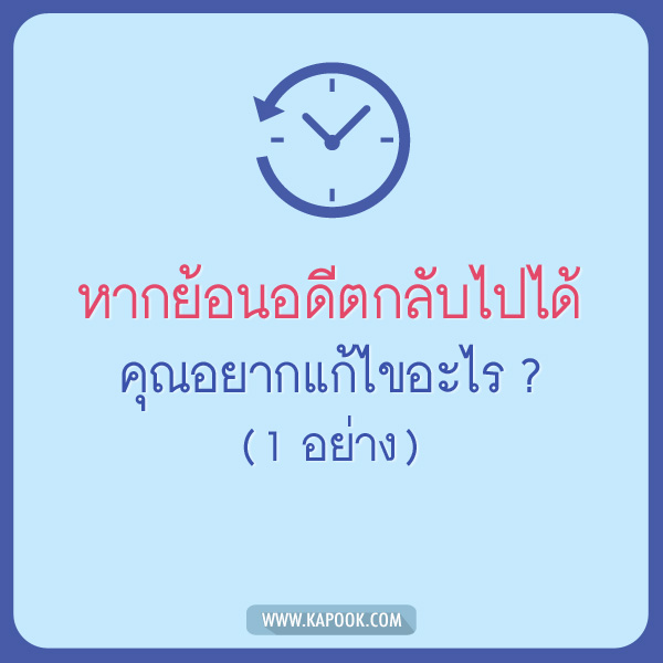แต่ถ้าหากเราย้อนเวลาได้ล่ะ ? ถ้าเรามีไทม์แมชชีนย้อนเวลากลับไปในอดีตได้ มีเรื่องไหนที่คุณอยากจะกลับไปแก้ไขไหม ? เช่น อยากกลับไปทำดีกับคนที่เรารัก เพราะตอนนั้นเราดูแลเขาไม่ดีพอ หรือย้อนกลับไปตอนก่อนจะเกิดแล้วขอเปลี่ยนเพศกำเนิดและหน้าตาของตัวเองซะเลย หรือว่าจะย้อนกลับไปซื้อสลากกินแบ่งรางวัลที่ 1 ของงวดที่แล้ว ตอนนี้จะได้รวยสมใจ แต่ข้อจำกัดคือ เลือกแก้ไขได้แค่ 1 อย่างเท่านั้นนะคะ