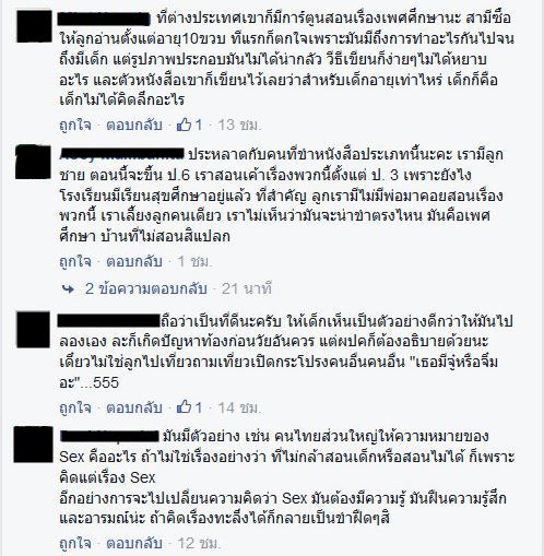 ส่วนบ้านเรา ก็อย่างที่เห็น ๆ กันครับ ไม่มีใครกล้าสอนเรื่องเพศศึกษาให้เด็ก บอกว่าโตขึ้นเดี๋ยวมึงก็รู้เอง สุดท้ายก็เตลิดเข้ารกเข้าพง ติดเชื้อทางเพศสัมพันธ์มั่ง ท้องในวัยเรียนมั่ง ชีวิตพังพินาศกันไป หรือพอมีใครเอาเรื่องเพศศึกษามาให้เรียนรู้ ก็จะถูกด่าถูกหัวเราะเยาะเหมือนในสเตตัสนี้นี่เอง แต่สำหรับพ่อแม่ที่มีการศึกษาจะเข้าใจว่าหนังสือเล่มนี้ไม่ใช่ของแย่หรือของไม่ดีอย่างที่ไอ้พวกนั้นเขาหัวเราะเยาะกัน