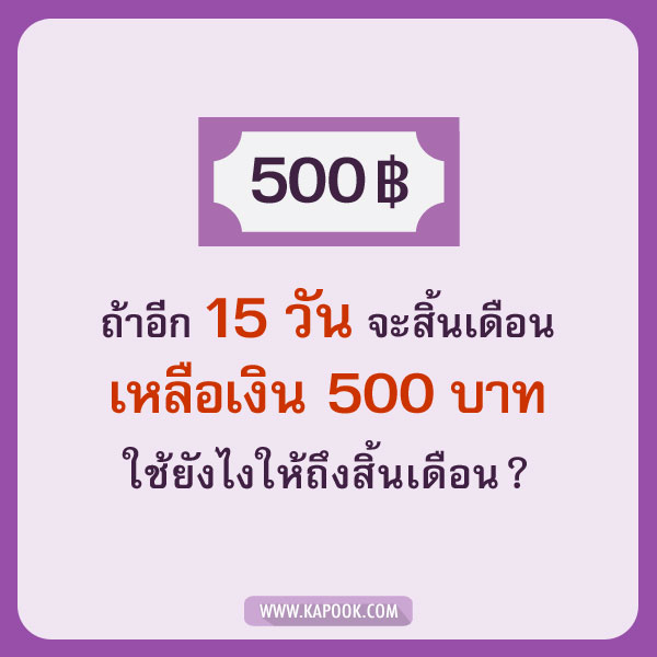 แล้วถ้าเดือนนี้เหลืออีกตั้ง 15 วัน กับเงิน 500 บาทในกระเป๋าล่ะ ? จะทำอย่างไร ? ลองมาคิดวิธีบริหารเงิน ว่าสูตรไหนถึงจะพอ อย่างเช่น บางคนอาจจะเลือกทานบะหมี่กึ่งสำเร็จรูป หรือซื้อข้าวเปล่ากับไข่ต้มทาน หรือว่าจะทานแค่วันละ 2 มื้อดี (อย่าลืมคิดค่าเดินทางด้วยนะ) ลองมาคิดกันดูเล่น ๆ นะคะ
