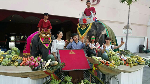 ชาวจีนร่วมเลี้ยงอาหารช้างเนื่องในวันช้างไทยในวันที่ 13 มีนาคม 2559 ณ สยามนิรมิต