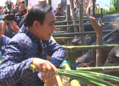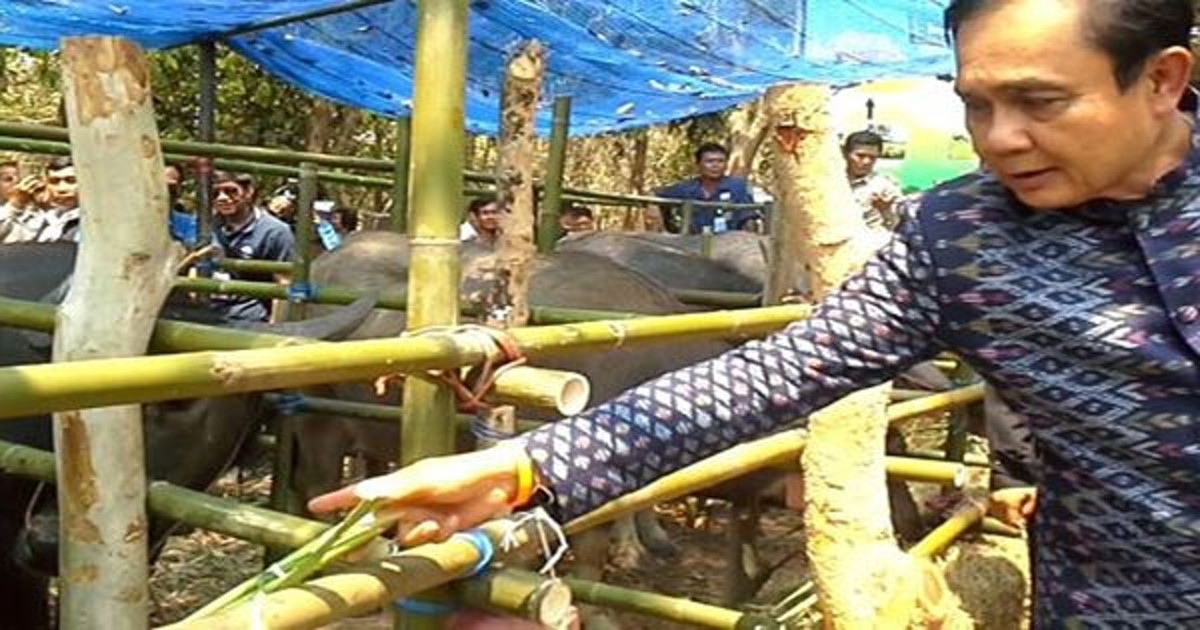 นายกฯ ป้อนหญ้าให้ควาย บอก ทำตัวดี ๆ อย่าดื้อนะชาติหน้าจะได้เกิดเป็นคน ขณะบางตัวไม่กิน เลยแหย่ไปว่า "สงสัยตัวนี้ไม่ชอบนายกฯ"