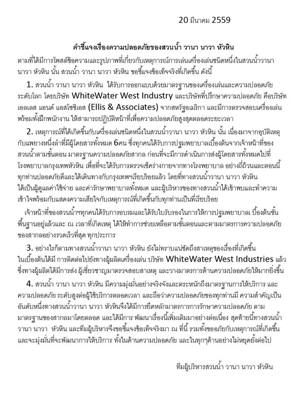 2. อุบัติเหตุที่เกิดขึ้น คือ แพยางที่มีผู้โดยสาร 6 คน ทุกคนได้รับการปฐมพยาบาลเบื้องต้นตามมาตรฐาน แล้วส่งตัวไปรักษาต่อที่โรงพยาบาลกรุงเทพหัวหิน โดยทุกคนปลอดภัยดี ขณะเดียวกัน สวนน้ำก็ได้ดูแลค่ารักษาพยาบาลเต็มที่
