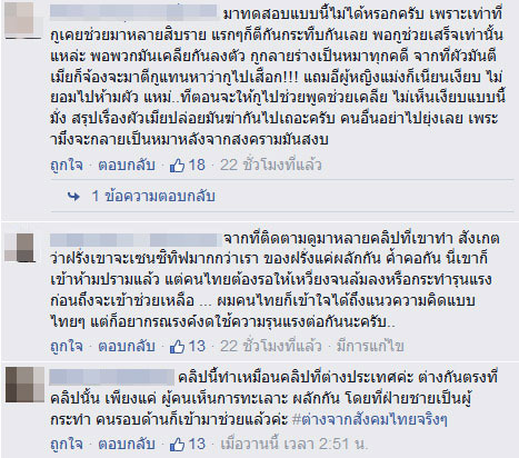 ผลปรากฏว่า คนไทยหลายรายมองเห็นเหตุการณ์แต่ไม่ยื่นมือเข้าช่วยเหลือ ซ้ำยังนั่งกดโทรศัพท์มือถือทั้ง ๆ ที่ฝ่ายชายตบตีฝ่ายหญิงอยู่ต่อหน้าต่อตา ในขณะที่บางรายทนไม่ได้ ต้องขอเข้าไปแทรกให้เลิกทะเลาะกัน โดยหลังจากที่มีคนใจกล้านำทีมห้ามทัพแล้ว ก็มีอีกหลายรายตามมาสมทบในภายหลัง