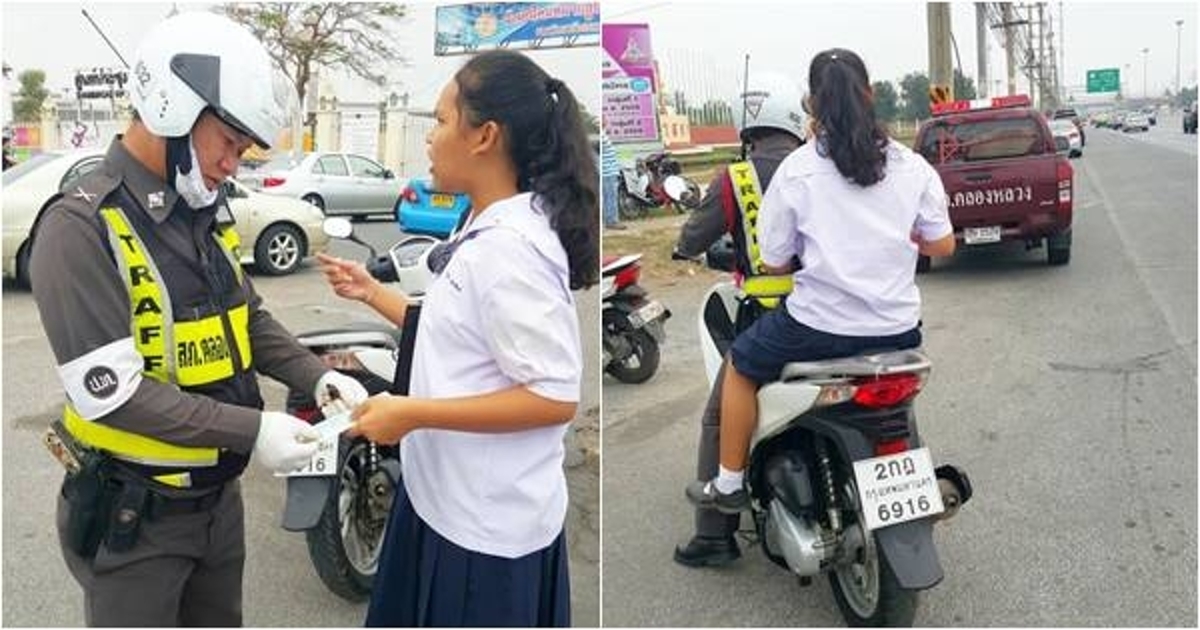โลกโซเชียลประทับใจ ภาพตำรวจคลองหลวงอาสาขี่มอเตอร์ไซค์ไปส่งนักเรียนหญิงที่เข้ามาขอความช่วยเหลือ หลังพบว่ามาสอบผิดที่