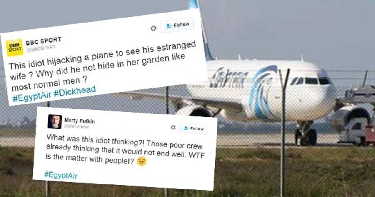 สื่อเจ้าดัง อย่างบีบีซี บ่นอุบในทวิตเตอร์ทางการว่า ถ้าอยากจะเจอเมียเก่าขนาดนั้น ทำไมไม่ไปนัดพบที่สวนอย่างที่ผู้ชายปกติเขาทำกัน ต้องลงทุนจี้เครื่องบินเพื่อการนี้เลยรึ ? พร้อมแฮชแท็ก #อียิปต์แอร์ #ไอ้สมองกลวง