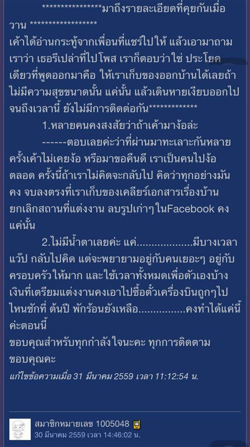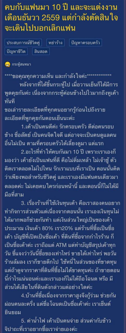 เป็นกระทู้เล่าเรื่องราวดราม่าของชีวิตคู่ที่ถูกแชร์สนั่นโลกออนไลน์ เมื่อวันที่ 30 มีนาคม 2559 สำหรับกระทู้ "คบกับแฟนมา 10 ปี และจะแต่งงานเดือนธันวา 2559 แต่กำลังตัดสินใจจะเดินไปบอกเลิกแฟน" โดย คุณ สมาชิกหมายเลข 1005048 สมาชิกเว็บไซต์พันทิปดอทคอม เล่าว่า เธอคบกับแฟนมา 10 ปี อายุห่างกัน 4 ปี เจอกันทาง MSN และคุยกันเรื่อย ๆ จนมานัดพบและเป็นแฟนกัน ฝ่ายชายมีหน้าที่การงานดี ปัจจุบันมีบ้าน 1 หลังที่ช่วยกันซื้อ และรถ 1 คันที่เขาซื้อเอง อยู่ด้วยกันมา 8 ปีแล้ว แต่ฝ่ายชายไม่เคยทำงานบ้านเลย