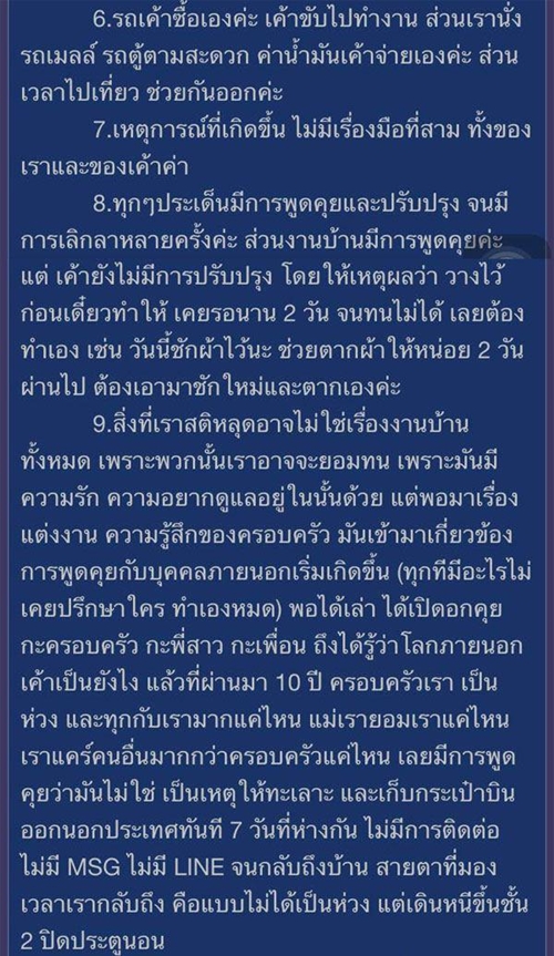 ตอนแรกเธอก็มีความสุขกับการดูแลเขาในระดับหนึ่ง แต่บางทีมันก็มากไป เธอต้องเปลี่ยนหลอดไฟเอง ยกตู้เอง ตัดหญ้า ปลูกต้นไม้ ซักผ้า รีดผ้า ทำกับข้าว ล้างรถทั้งหมด ไปเที่ยวกางเต็นท์ เธอต้องเป็นคนกางเอง เก็บเอง เขาจะหลบในร่มรอ เธอเคยออกจากงานมาทำกิจการเล็ก ๆ โดยใช้เงินของฝ่ายชายเป็นทุน พอกิจการไปได้ดี ก็นำเงินไปซื้อที่ดิน แฟนจะพยายามถามตลอดว่าได้กำไรเท่าไร จะคืนเขายังไง พอกิจการล้ม เขาก็ถามถึงแต่เงินทุน แม้ที่ดินที่ซื้อไว้ยังอยู่ แต่ไม่ได้เงินคืน ก็ทะเลาะจนจะเลิกกันไป แต่ความผูกพันก็ยังทำให้กลับมาคบกัน จนคิดจะแต่งงานกัน